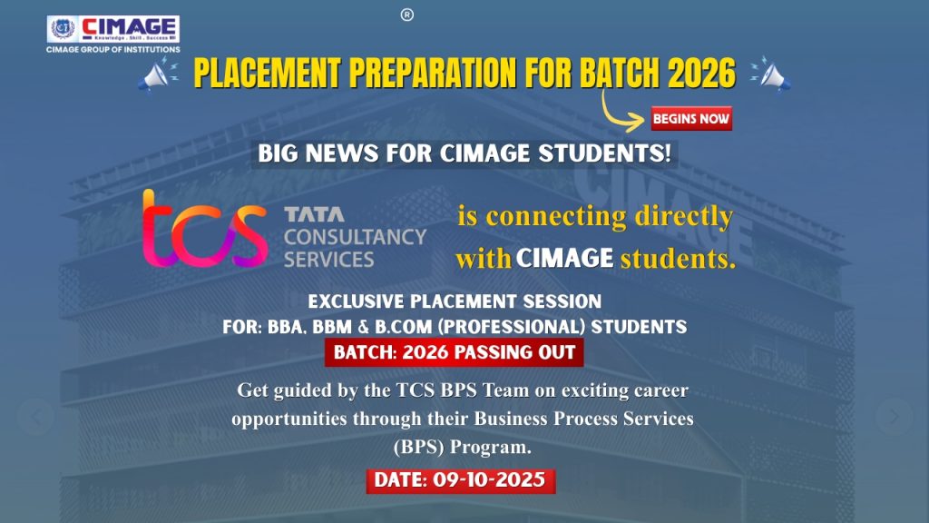 CIMAGE College, Patna has once again taken a remarkable step in preparing its students for the corporate world. Continuing its legacy of excellence in placements, the college is set to host a special Placement Preparation Initiative Meeting, organized in collaboration with Tata Consultancy Services (TCS). This exclusive session is designed for the 2026 batch students of BBA, BBM and B.Com (Professional) programs and aims to help them understand how to seize promising job opportunities with TCS Business Process Services (BPS).